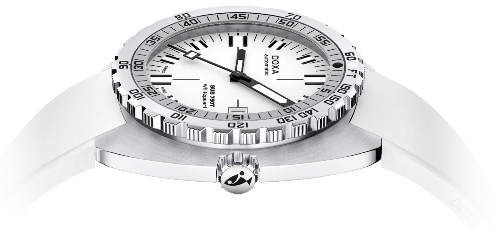 Doxa SUB 750T Whitepearl 825.10.011.23 jsou pánské automatické potápěčské hodinky na bílém kaučukovém řemínku s překlápěcí sponou. Pouzdro z nerezové oceli má průměr 45 milimetrů, šroubovací korunku a jednosměrně otočnou lunetu s dvojitou stupnicí. Minutová stupnice pro zobrazení doby ponoru a stopová stupnice pro hloubku. Bílý číselník s ukazatelem data na třetí hodině je chráněn odolným safírovým sklem. Ručičky a indexy pokrývá luminiscenční nátěr SuperLuminova®, který po nasvícení garantuje perfektní čitelnost za zhoršených světelných podmínek. Pohon hodinek zajišťuje mechanický strojek SW300 s automatickým nátahem a rezervou chodu 56 hodin. S vodotěsností 75 ATM jsou hodinky vhodné pro přístrojové potápění.