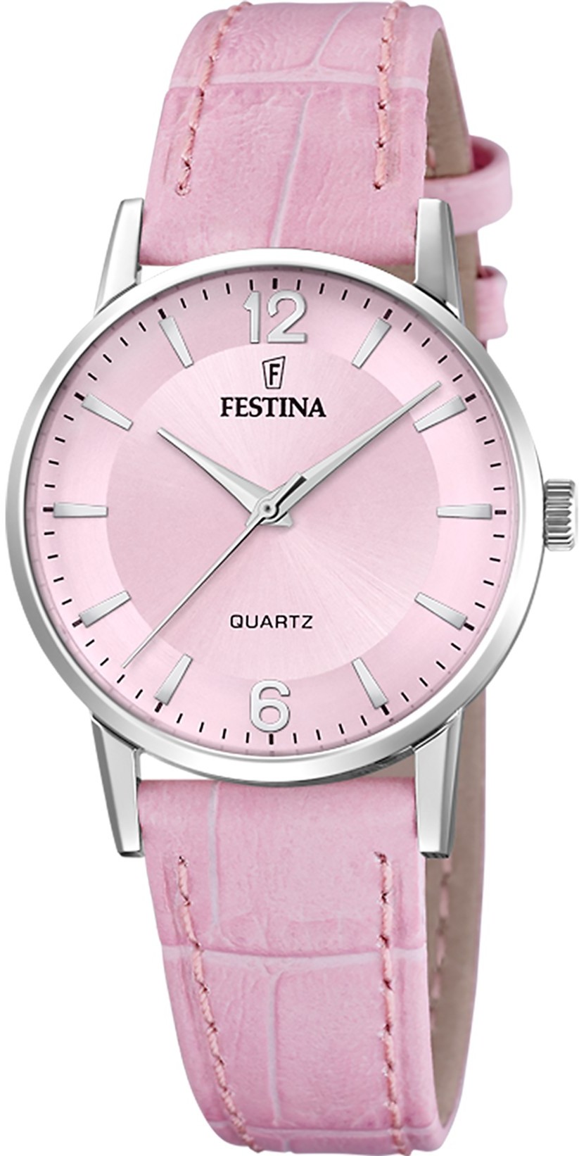 Festina Classics 20691/3 jsou dámské elegantní bateriové hodinky na růžovém koženém řemínku s trnovou sponou. Pouzdro z nerezové oceli má průměr 29 milimetrů. Růžový číselník s efektem slunečního brusu je chráněn odolným minerálním sklíčkem. Chod hodinek zajišťuje quartzový strojek Miyota 2035 s přesností ±20 sekund za měsíc. S vodotěsností 3 ATM jsou hodinky odolné proti dešti a při mytí rukou.