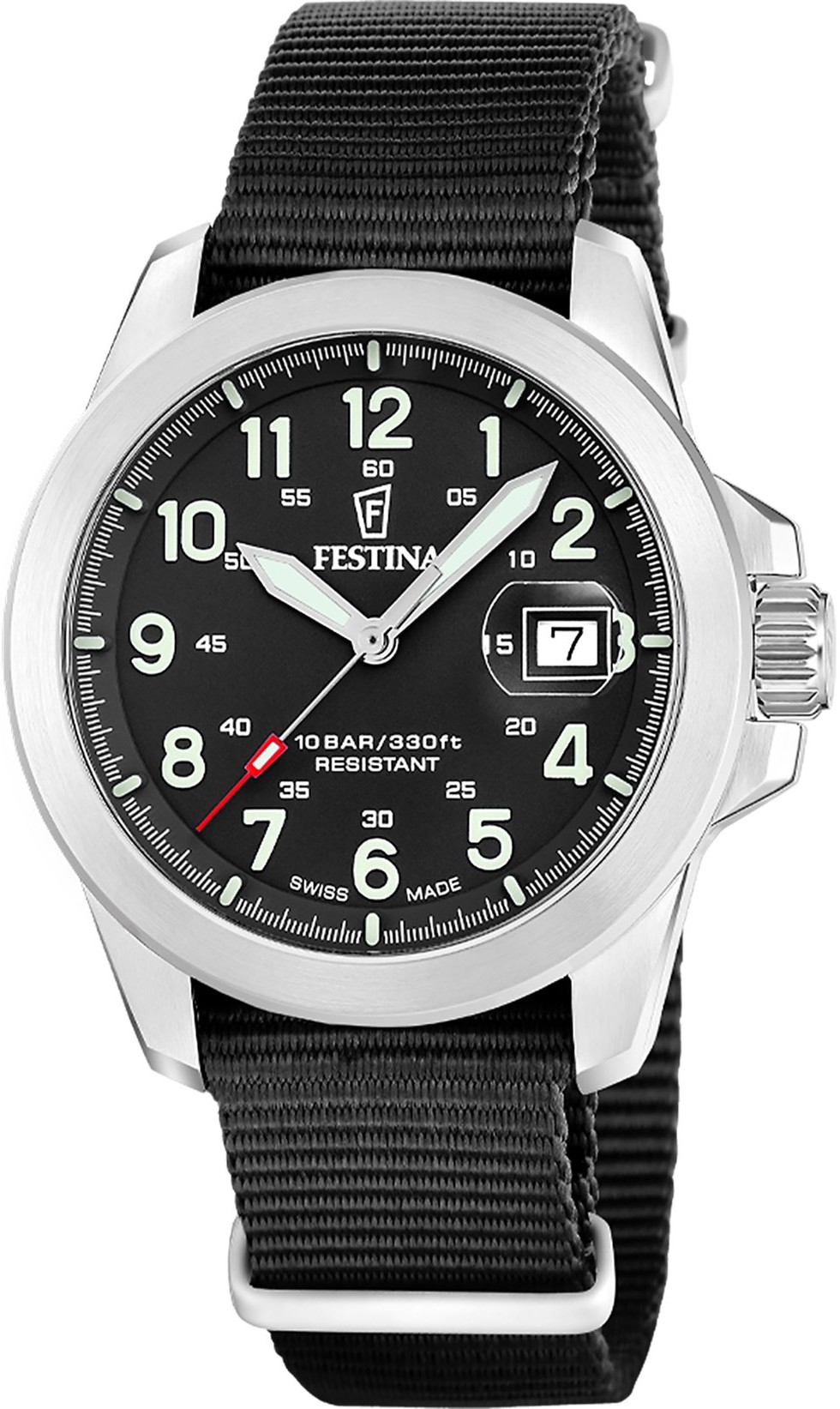 Festina Swiss Made Field Watch 20081/4 jsou pánské bateriové hodinky v klasickém stylu na ocelovém náramku s překlápěcí sponou. Pouzdro z nerezové oceli má průměr 41,8 milimetru a šroubovací korunku. Černý číselník je chráněn odolným safírovým sklíčkem s antireflexní vrstvou a s lupou nad ukazatelem data. Ručičky a indexy mají luminiscenční vrstvu SuperLuminova®, která po nasvícení usnadňuje čitelnost za zhoršených světelných podmínek. Chod hodinek zajišťuje quartzový strojek Ronda 715. S vodotěsností 10 ATM jsou hodinky vhodné pro plavání či šnorchlování. Součástí balení jsou 2 náhradní řemínky v černé barvě - kožený a NATO řemínek.