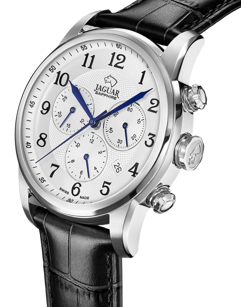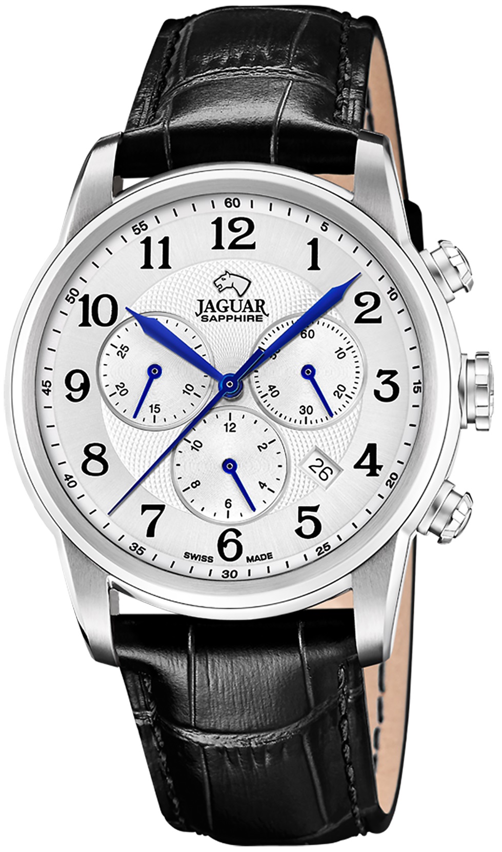 Jaguar Acamar J968/7 jsou pánské sportovně-elegantní bateriové hodinky na černém koženém řemínku s trnovou sponou. Pouzdro z nerezové oceli má průměr 42 milimetrů. Stříbrný texturovaný číselník se stopkami a indikací data je chráněn odolným safírovým sklem. Pohon hodinek zajišťuje švýcarský quartzový strojek Ronda 5030D. S vodotěsností 5 ATM jsou hodinky odolné proti dešti a při sprchování.