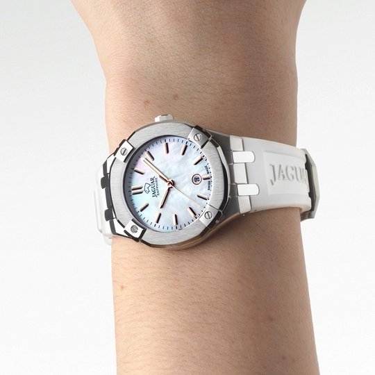 Jaguar Diplomatic J1017/1 jsou dámské sportovní bateriové hodinky na bílém kaučukovém řemínku s trnovou sponou. Pouzdro z nerezové oceli má průměr 35,5 milimetru. Perleťový číselník s ukazatelem data na šesté hodině je chráněn odolným safírovým sklem a jeho krása vyniká zejména na přímém světle, kdy můžeme pozorovat hru barev perleti. Ručičky a indexy pokrývá luminiscenční nátěr, který po nasvícení garantuje perfektní čitelnost za zhoršených světelných podmínek. Pohon hodinek zajišťuje quartzový strojek Harley 785. S vodotěsností 10 ATM jsou hodinky vhodné pro plavání a šnorchlování.