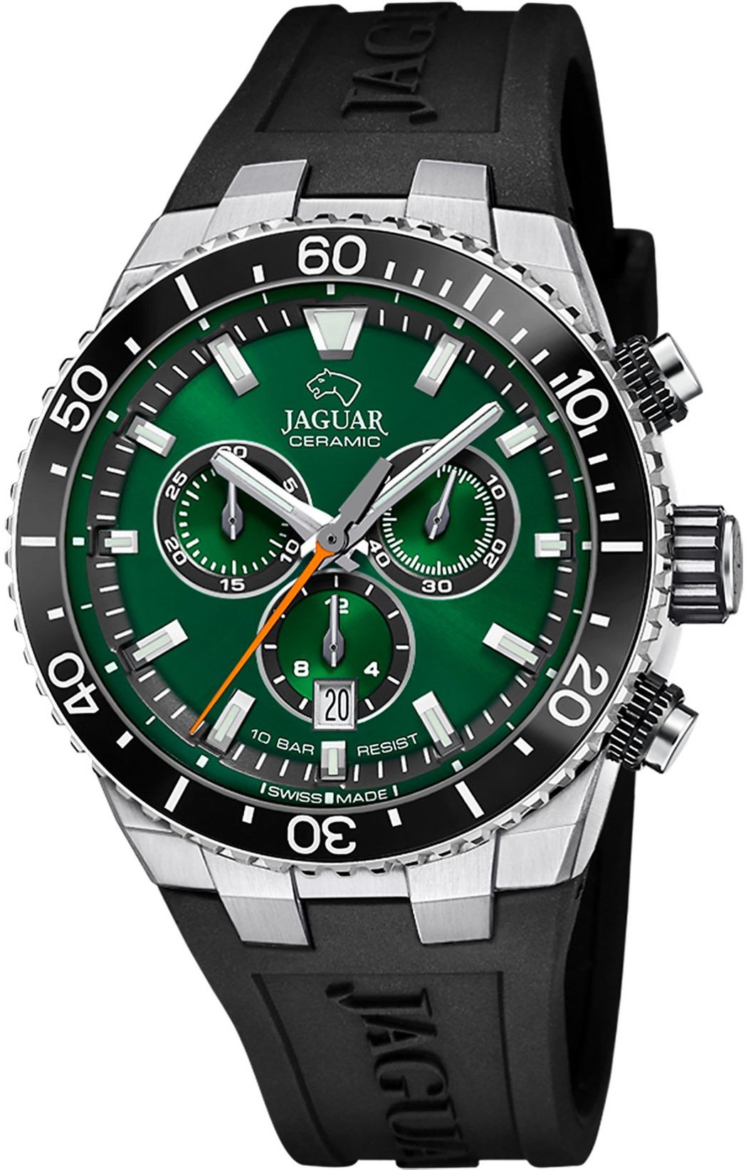 Jaguar Ceramic J1021/2 jsou pánské sportovní bateriové hodinky na černém kaučukovém řemínku s trnovou sponou. Pouzdro z nerezové oceli má průměr 44,8 milimetru a otočnou lunetu s černou keramickou vložkou s minutovou stupnicí. Zelený číselník s efektem slunečního brusu, ukazatelem data a stopkami je chráněn odolným safírovým sklem s antireflexní vrstvou. Ručičky a indexy pokrývá luminiscenční nátěr, který po nasvícení garantuje perfektní čitelnost za zhoršených světelných podmínek. Pohon hodinek zajišťuje švýcarský quartzový strojek Ronda 5030D. S vodotěsností 10 ATM jsou hodinky vhodné pro plavání a šnorchlování.