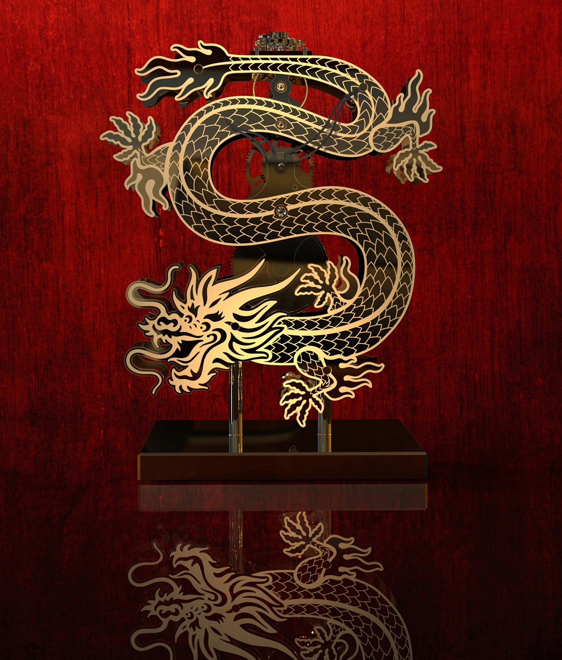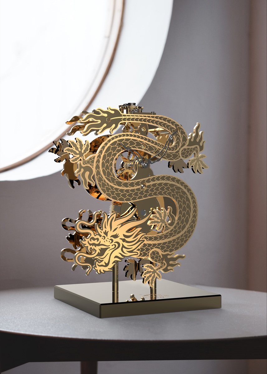 Limitovaná edice 88 kusů ve zlaté barvě inspirovaná čínským drakem. Drak je symbolem moci, síly a prosperity. Jako mýtická bytost je drak často spojován s příznivými vlastnostmi, ztělesňuje ducha vůdcovství a dokonalosti. Každá kontura dračí postavy, od jeho klikatých křivek až po složité detaily jeho šupin, slouží jako důkaz přesnosti požadované v hodinářství. Ozubená kola, kolečka a pružiny uvnitř zrcadlí anatomii draka. Tyto nevšední stolní hodiny se natahují pomocí oboustranného klíče, kterým se také nastavuje čas.