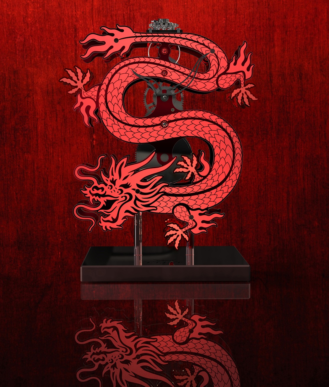 Limitovaná edice 88 kusů v červené barvě inspirovaná čínským drakem. Drak je symbolem moci, síly a prosperity. Jako mýtická bytost je drak často spojován s příznivými vlastnostmi, ztělesňuje ducha vůdcovství a dokonalosti. Každá kontura dračí postavy, od jeho klikatých křivek až po složité detaily jeho šupin, slouží jako důkaz přesnosti požadované v hodinářství. Ozubená kola, kolečka a pružiny uvnitř zrcadlí anatomii draka. Tyto nevšední stolní hodiny se natahují pomocí oboustranného klíče, kterým se také nastavuje čas.