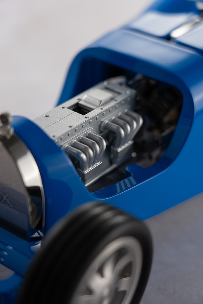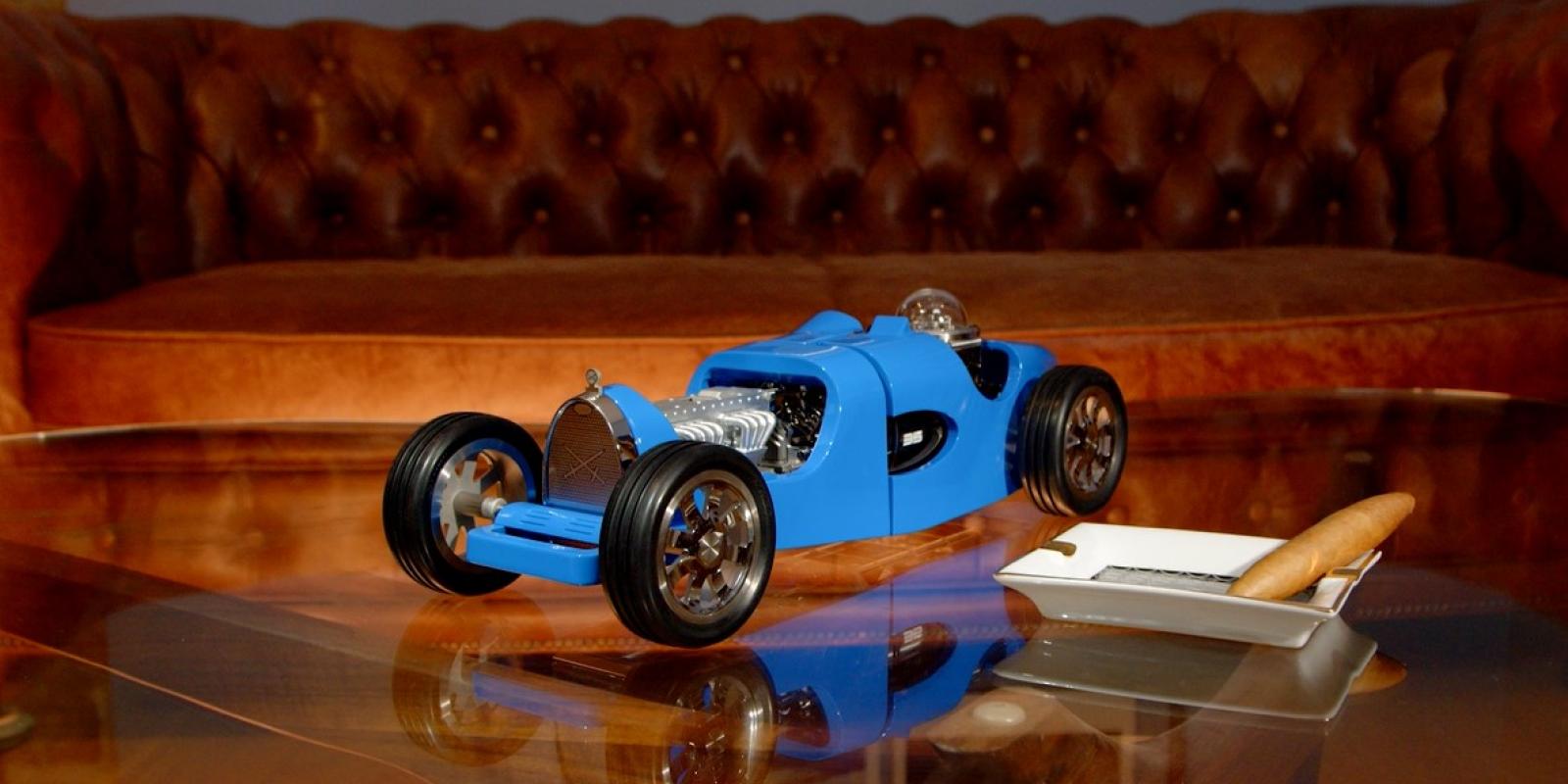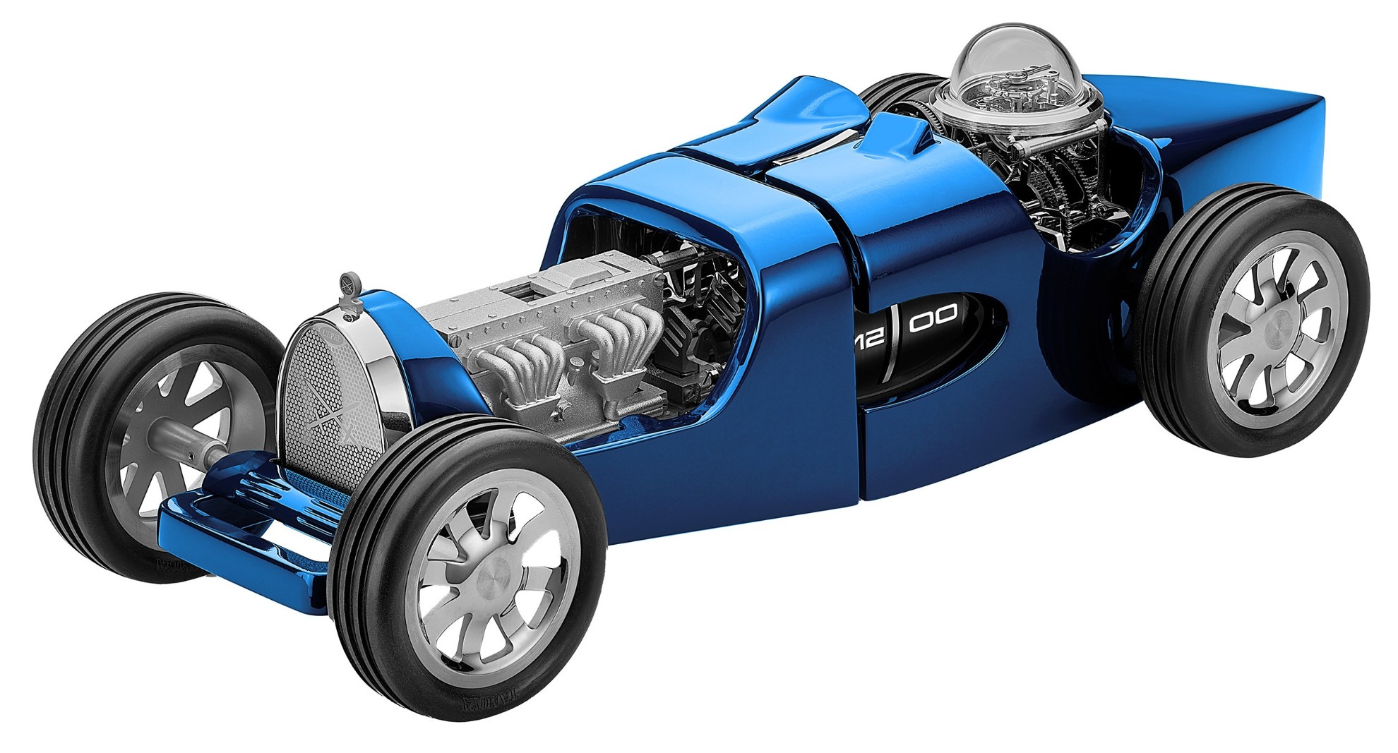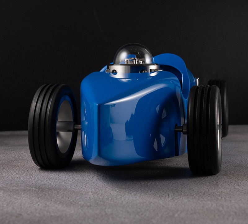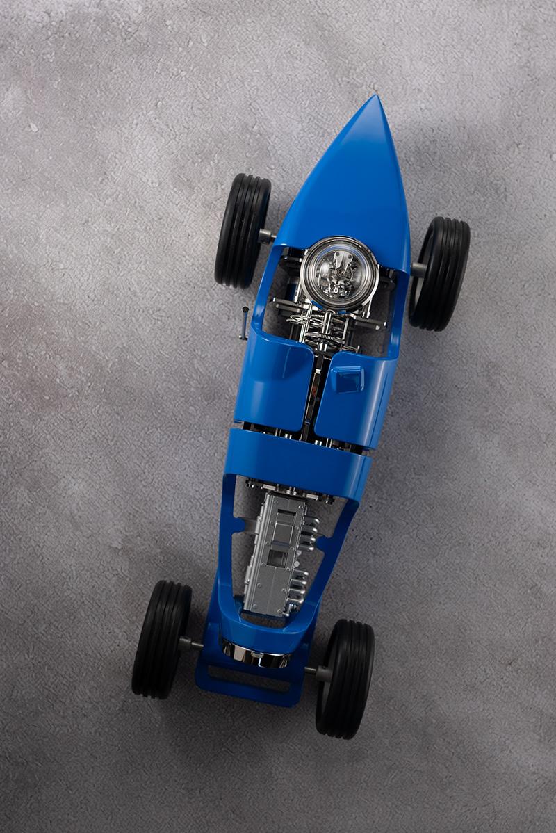 Limitovaná edice 100 kusů v závodní modré barvě inspirovaná závodním vozem 20. a 30.let 20. století, který je pravděpodobně považován za nejlepší závodní vůz všech dob. Tyto nevšední stolní hodiny se natahují pomocí zadních koleček a jsou dokonalým gentlemanským doplňkem. Jednoduchým zatažením ruční brzdy se uvolní motor V8 a odhalí uvnitř skrytý zapalovač. V dnešním uspěchaném světě vás L'Epée 1839 zve, abyste si udělali chvilku pro sebe a ocenili skvělé okamžiky i malé luxusy v životě. Čas se nastavuje otáčením volantu proti směru hodinových ručiček.