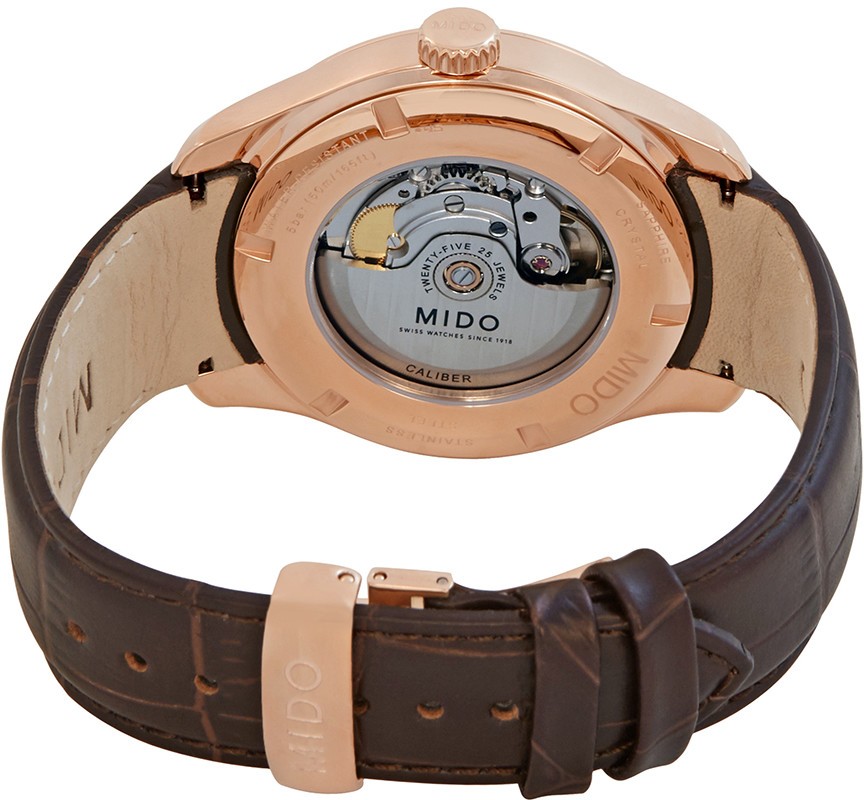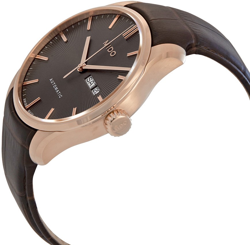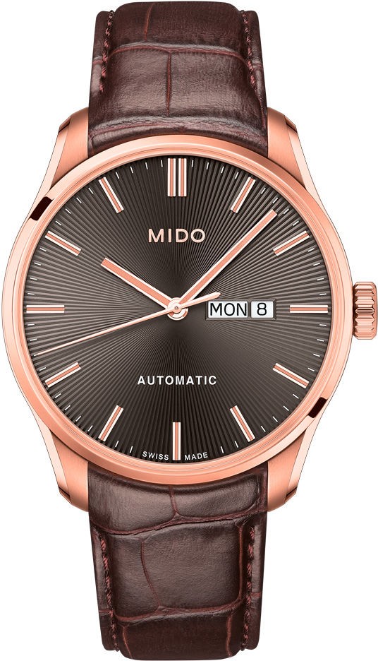 Mido Belluna Sunray M024.630.36.061.00 jsou pánské automatické elegantní hodinky na hnědém koženém řemínku s motýlkovou sponou. Pouzdro z nerezové oceli s povrchovou PVD úpravou v barvě růžového zlata má průměr 42,5 milimetru a průhledné dýnko. Antracitový číselník s efektem slunečního brusu a ukazatelem data a dne v týdnu je chráněn odolným safírovým sklem s antireflexní vrstvou. Pohon hodinek zajišťuje mechanický strojek Caliber 80 s automatickým nátahem a rezervou chodu 80 hodin. Díky použití antimagnetického vlásku setrvačky Nivachron™ z titanové slitiny, na jehož vývoji se spolu se Swatch Group podílela manufaktura Audemars Piguet, je tento kalibr vysoce odolný vůči vlivům magnetického pole. Tento strojek s funkcí hackingu lze v případě potřeby natahovat i ručně pomocí signované korunky. S vodotěsností 5 ATM jsou hodinky odolné proti dešti a při sprchování.