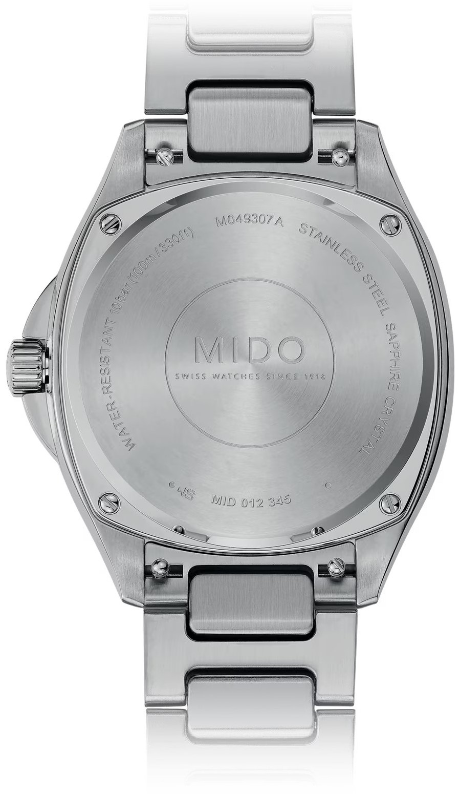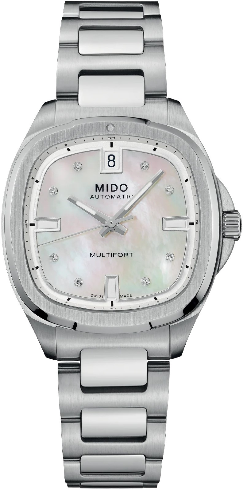 Mido Multifort TV 35 M049.307.11.106.00 jsou dámské automatické hodinky v klasickém stylu na ocelovém náramku s motýlkovou sponou. Pouzdro z nerezové oceli ve tvaru televizoru má velikost 35 x 34,2 milimetru a je inspirováno kultovním designem 70. let. Perleťový číselník s ukazatelem data na 12. hodině a 8 diamanty o hmotnosti 0,0304 ct a čistotě VS-SI je chráněn odolným safírovým sklem s antireflexní vrstvou a jeho krása vyniká zejména na přímém světle, kdy můžeme pozorovat hru barev perleti. Ručičky a indexy pokrývá luminiscenční nátěr SuperLuminova, který po nasvícení garantuje perfektní čitelnost za zhoršených světelných podmínek. Pohon hodinek zajišťuje mechanický strojek Caliber 72 s automatickým nátahem a rezervou chodu 72 hodin. Díky použití antimagnetického vlásku setrvačky Nivachron™ z titanové slitiny, na jehož vývoji se spolu se Swatch Group podílela manufaktura Audemars Piguet, je tento kalibr vysoce odolný vůči vlivům magnetického pole. Tento strojek s funkcí hackingu lze v případě potřeby natahovat i ručně pomocí signované korunky. S vodotěsností 10 ATM jsou hodinky vhodné pro plavání či šnorchlování.
