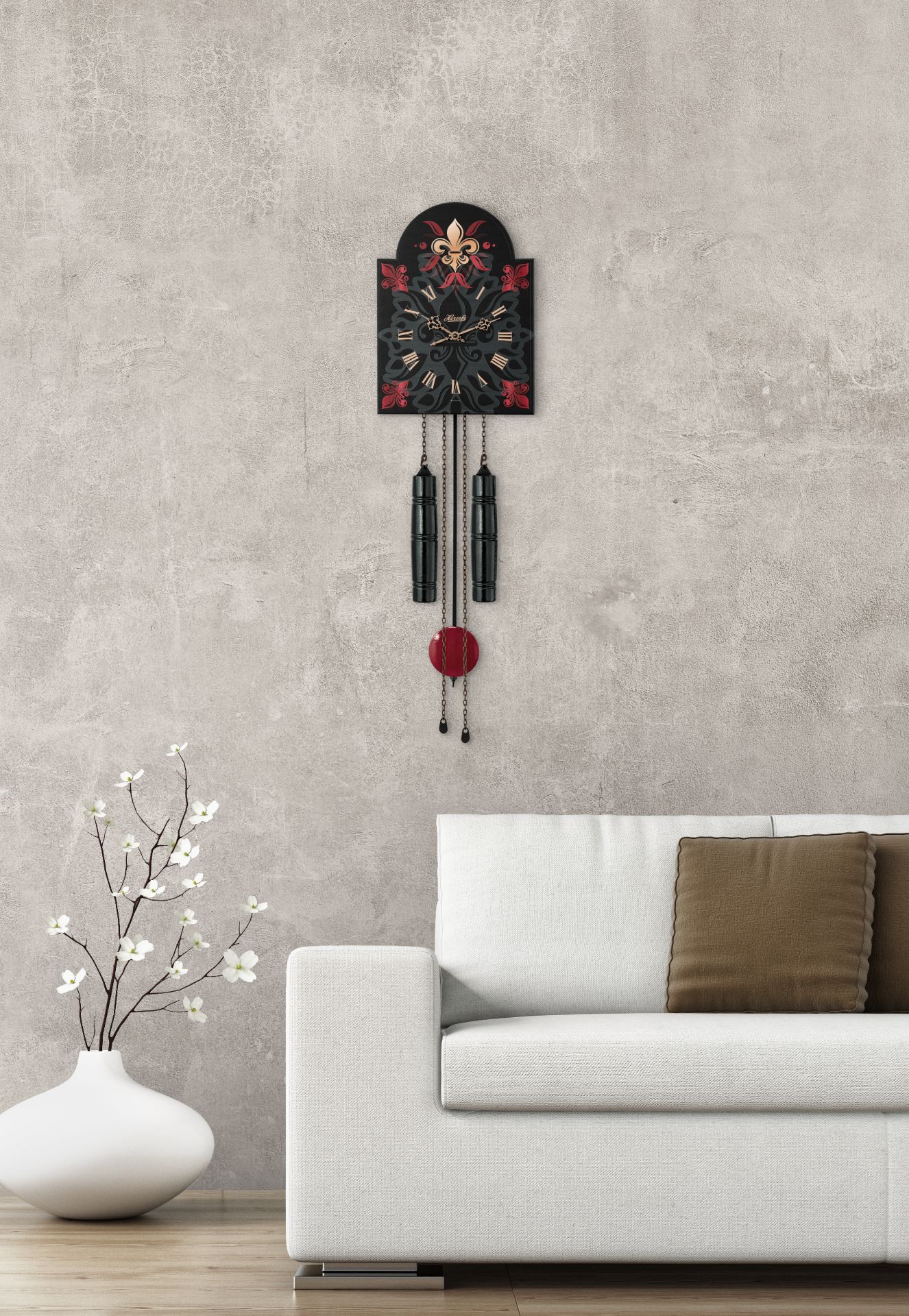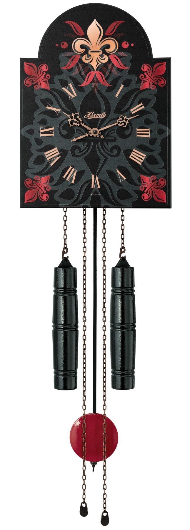 Nástěnné dřevěné kyvadlové hodiny v moderním designu v kombinaci s mechanickým 8denním strojkem s odbíjením každou půlhodinu. Obě závaží i řetěz jsou vyvedeny v černé barvě, kotouč kyvadla v červené barvě, která ladí s ornamenty na číselníku.