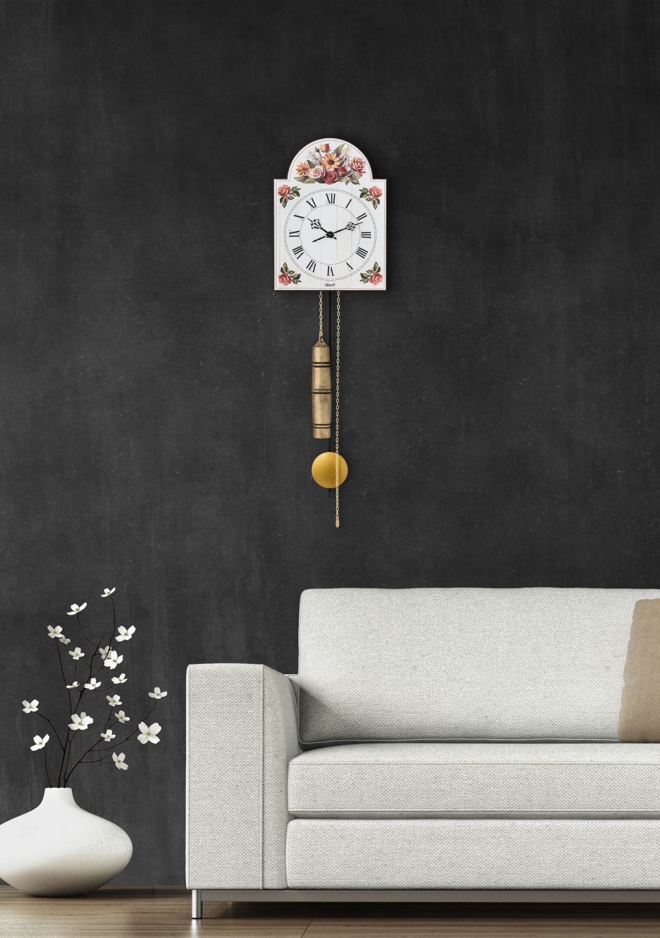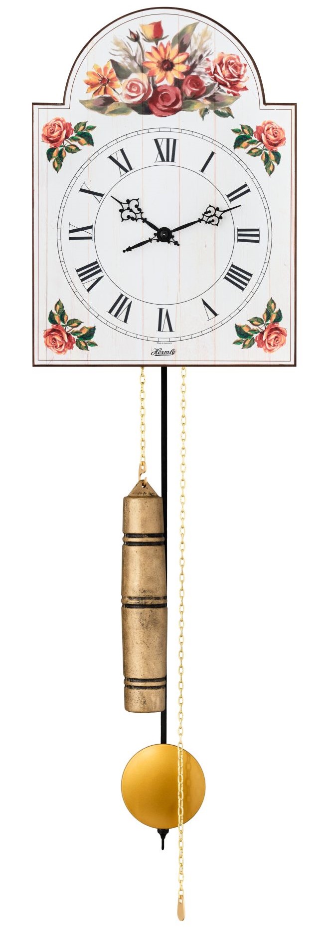 Nástěnné dřevěné kyvadlové hodiny v moderním designu v kombinaci s mechanickým 8denním strojkem s odbíjením každou hodinu. Bílý číselník s římskými číslicemi zdobí květinový vzor. Závaží, řetěz i koutouč kyvadla jsou vyvedeny ve zlaté barvě.
