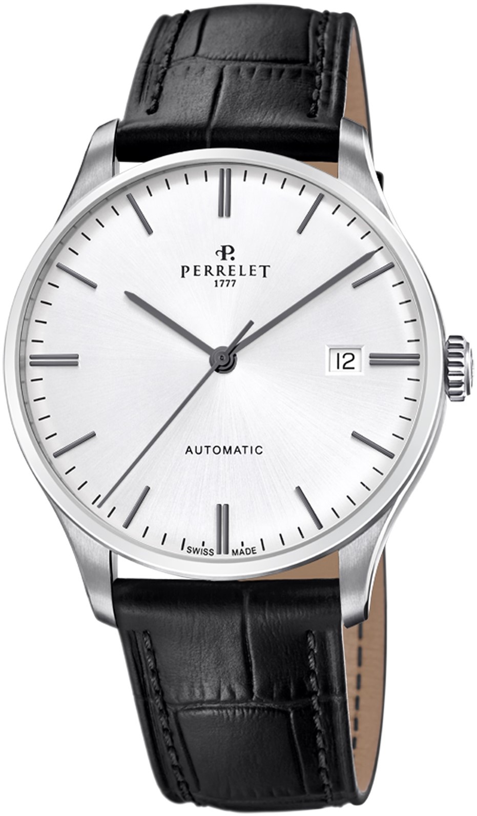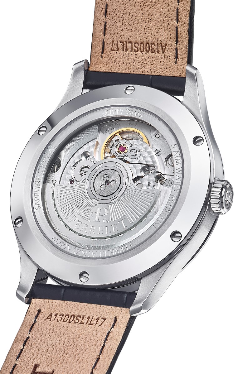 Perrelet Weekend 3 Hands A1300/1 jsou pánské automatické elegantní hodinky na černém koženém řemínku s trnovou sponou. Pouzdro z nerezové oceli má průměr 39 milimetrů a průhledné dýnko nabízející pohled na strojek dekorovaný ženevskými pruhy. Stříbrný číselník s efektem slunečního brusu a ukazatelem data na třetí hodině je chráněn odolným safírovým sklem. Pohon hodinek zajišťuje mechanický strojek P-321 s automatickým nátahem a rezervou chodu 42 hodin. Kalibr je vybaven ochranou proti nárazům „Incabloc“. S vodotěsností 5 ATM jsou hodinky odolné proti dešti a při sprchování.