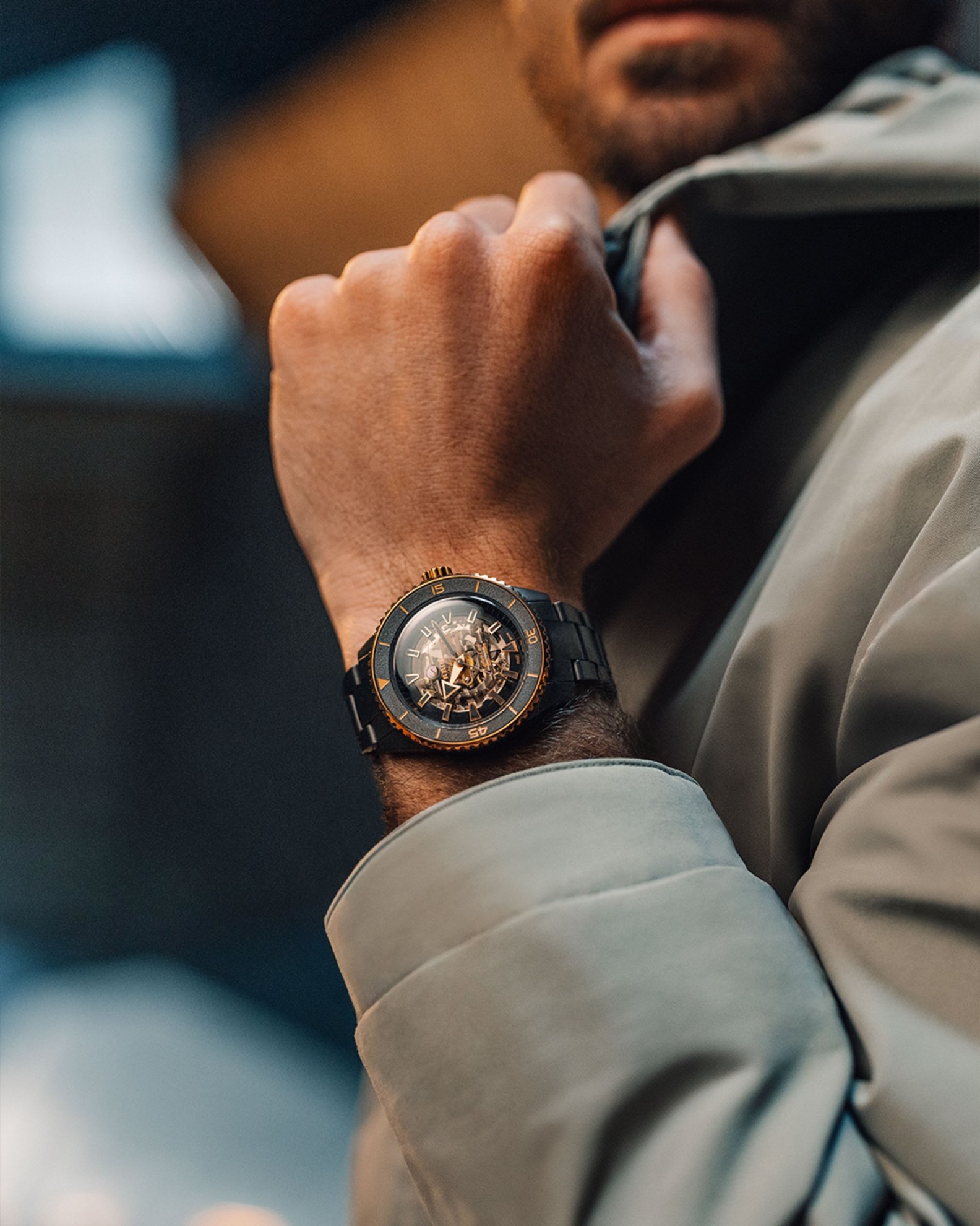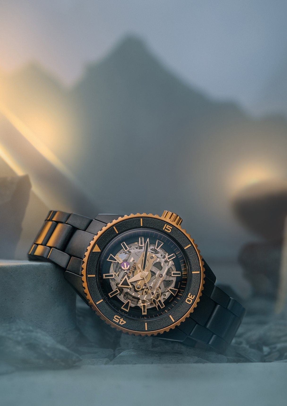 Rado Captain Cook High-Tech Ceramic Skeleton R32192152 jsou pánské potápěčské hodinky s automatickým strojkem. Černé monoblokové keramické pouzdro má průměr 43 milimetrů a je stejně jako náramek vyrobeno z odolného materiálu High-Tech Ceramic v matném provedení. Díky tomuto materiálu jsou hodinky lehké, hypoalergenní a odolné vůči poškrábání. Indexy, ručky, korunka a otočná luneta s keramickou vložkou s detaily v barvě růžového zlata kontrastují s pouzdrem a náramkem v černém provedení. Safírové sklo je ošetřeno antireflexní vrstvou z obou stran. Transparentní číselník i zadní dýnko odhaluje kalibr R808 (03.808.260). Tento mechanický strojek s automatickým nátahem a rezervou chodu 80 hodin disponuje funkcí hackingu (zastavení vteřinové ručky při vytažení korunky do krajní polohy) a je možné ho v případě potřeby natahovat i ručně. Díky použití antimagnetického vlásku setrvačky Nivachron™ z titanové slitiny, na jehož vývoji se spolu se Swatch Group podílela manufaktura Audemars Piguet, je tento kalibr vysoce odolný vůči vlivům magnetického pole. Pro dosažení co nejvyšší možné přesnosti je stroj testován v pěti pozicích. Hodinky disponují vysokou vodotěsností 300 metrů a jsou tedy vhodné pro hlubinné potápění.