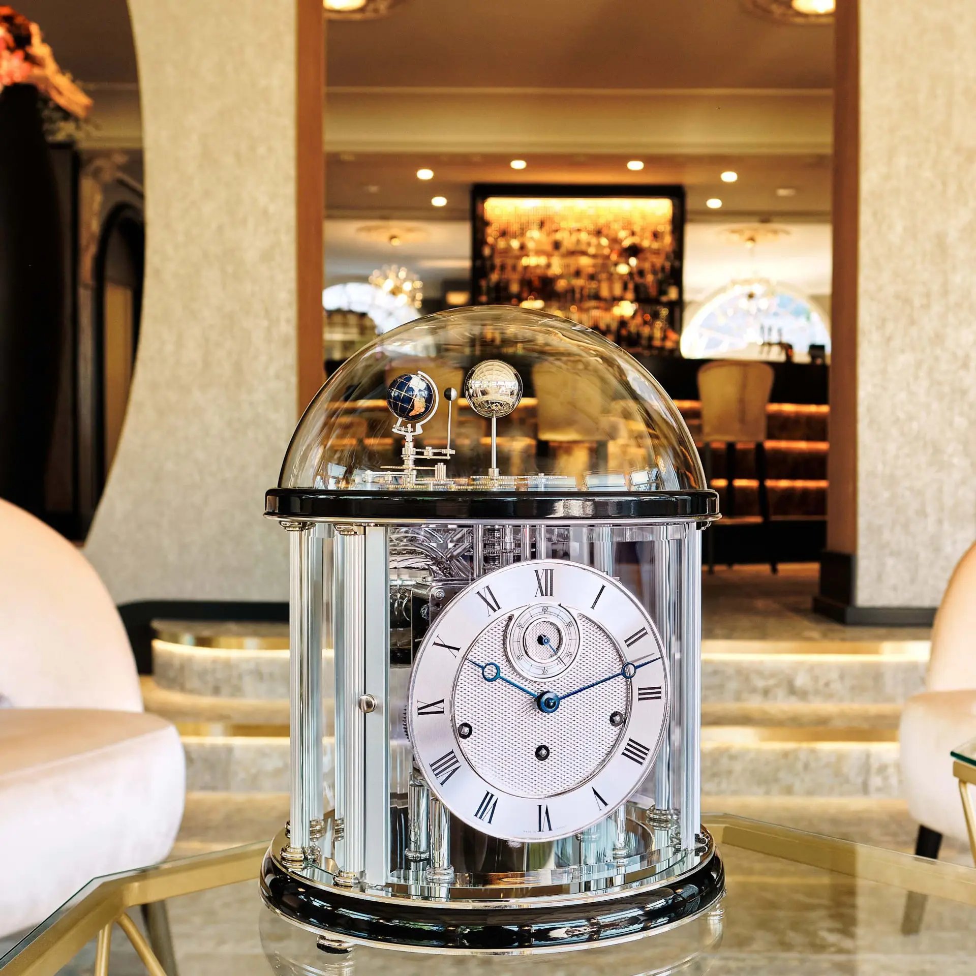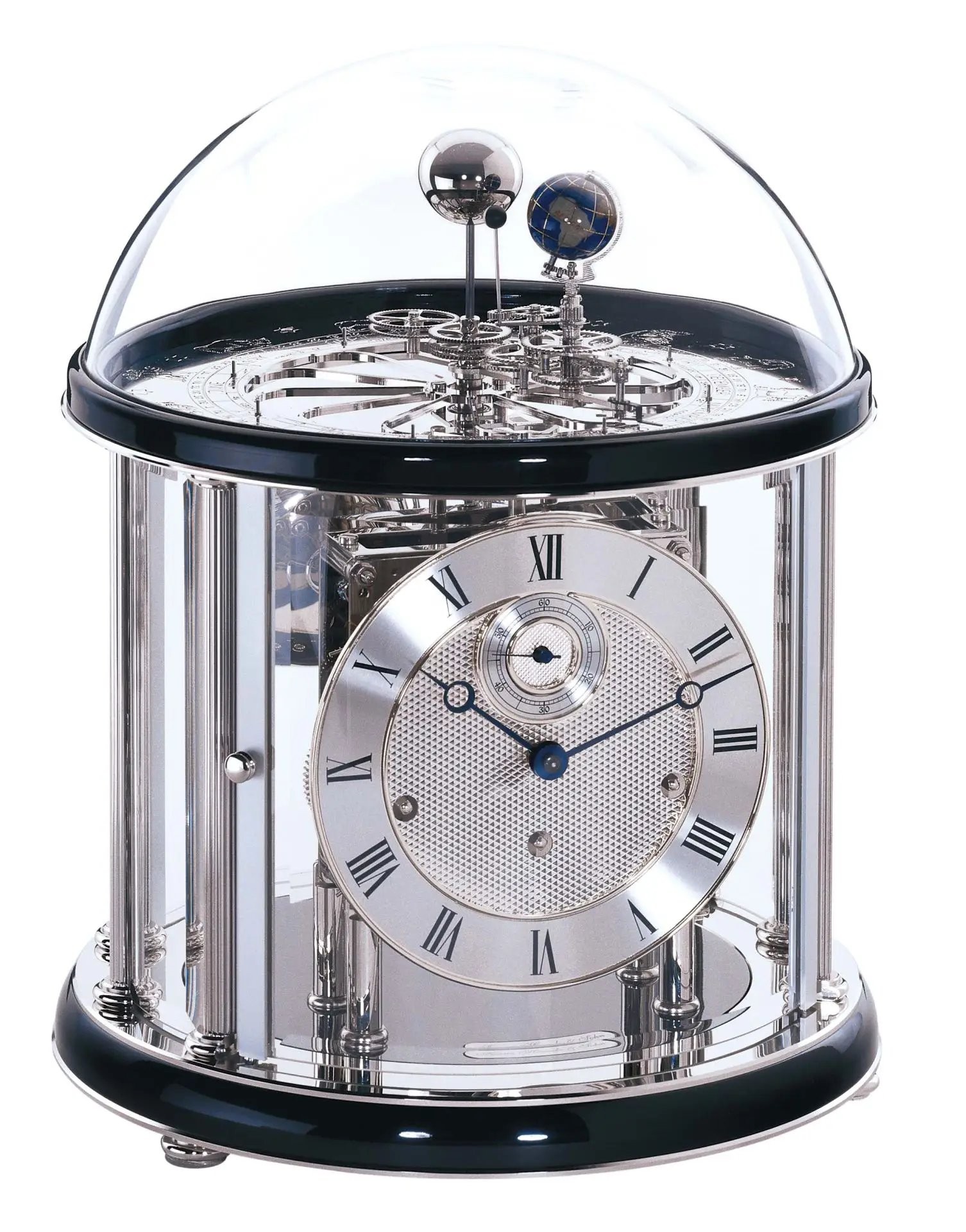 Německé stolní hodiny s podstavcem ze dřeva v černé barvě, na který navazuje čiré minerální sklo umožňující nahlédnout na strojek z různých stran. Hodiny neukazují pouze čas, ale znázorňují i naši sluneční soustavu. V horní části pod skleněnou kopulí můžeme vidět aktuální polohu Země ke Slunci, otáčení Země kolem vlastní osy a také reprodukci měsíční fáze viditelné ze Země. Na kotouči z leštěného kovu se nachází frézovaná znamení zvěrokruhu a vedle něj rozety s vyrytými měsíci a dny v roce. Hodiny disponují funkcí automatického nočního vypnutí odbíjení. To vše zajišťuje mechanický strojek osázený 11 kameny, který se natahuje jednou za osm dní. Každých 15 minut odbije a zároveň na 4 leštěných zvoních zahraje melodii Westminster, jejíž délka se s přibývajícím časem stupňuje. Odbíjení i melodii lze vypnout ručně.