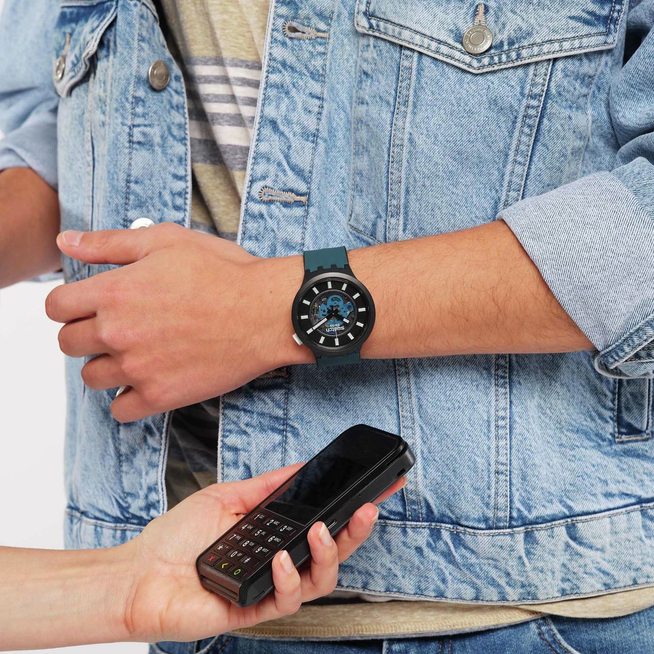 A jak to funguje? V každém modelu hodinek SwatchPAY! je ukrytý NFC čip, který funguje stejným způsobem jako vaše běžná platební karta, která umožňuje bezkontaktní platby. Velkou výhodou je, že NFC čip nijak neovlivňuje výdrž baterie hodinek. Stačí hodinky přiblížit k platebnímu terminálu, jehož čtečka si s NFC čipem vymění platební informace a máte hotovo. Ztratili jste hodinky? Žádnou paniku. Stačí jedním kliknutím deaktivovat platební funkci hodinek ve SwatchPAY! aplikaci ve vašem telefonu či tabletu. A stejně jako všechny Swatch hodinky, jsou i modely SwatchPAY! voděodolné do 30 metrů.